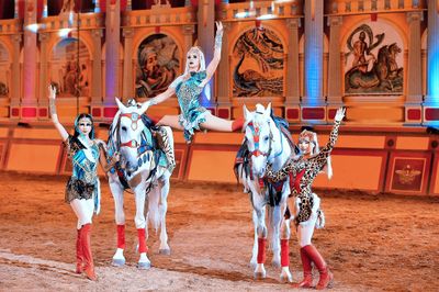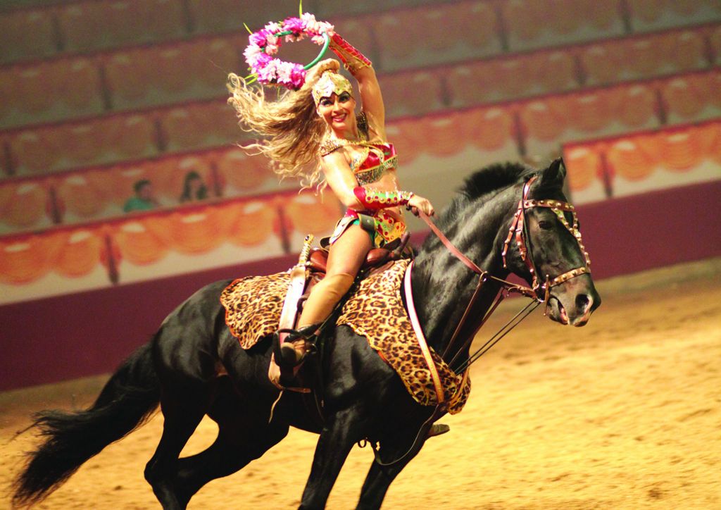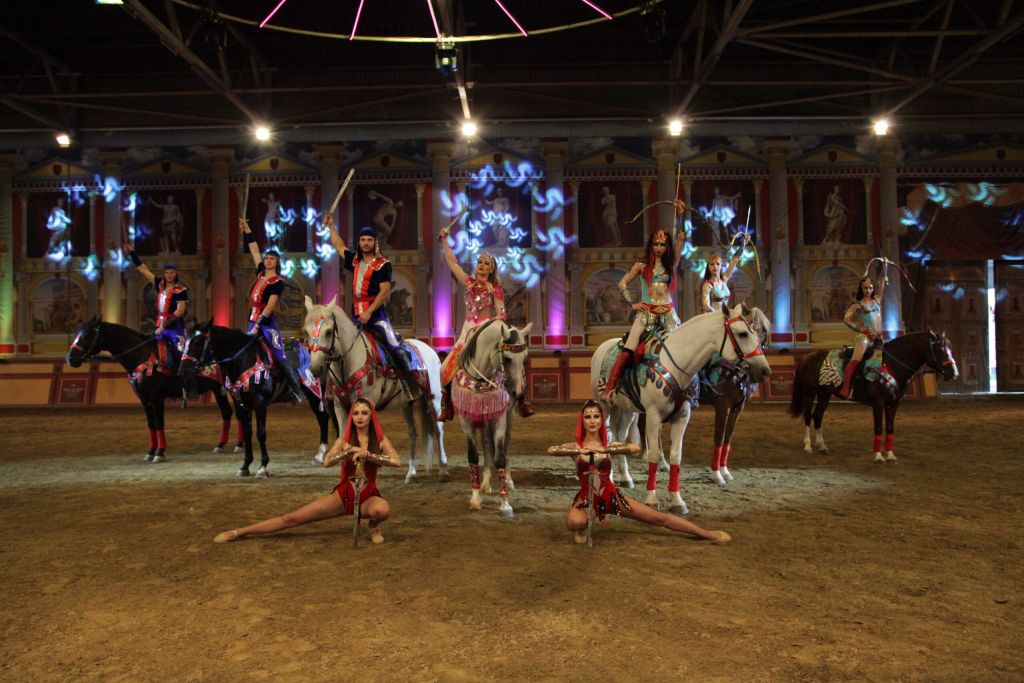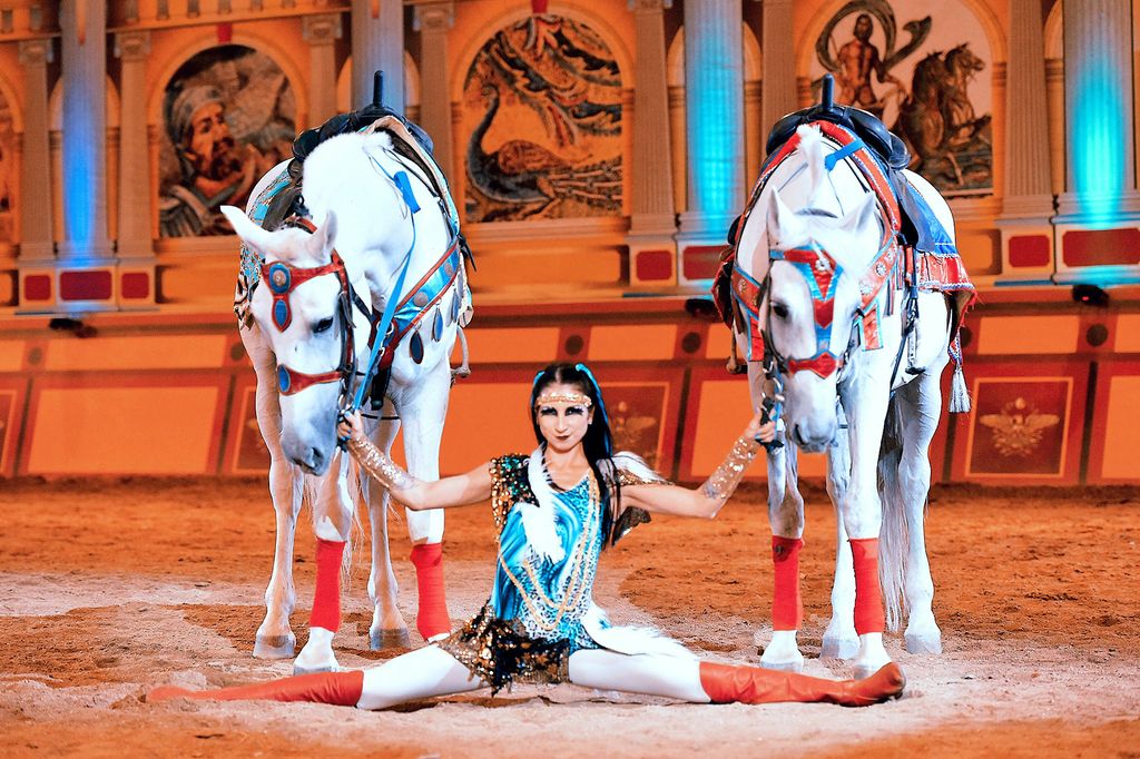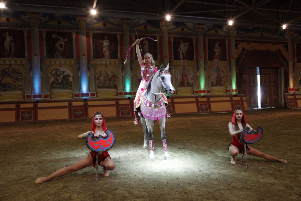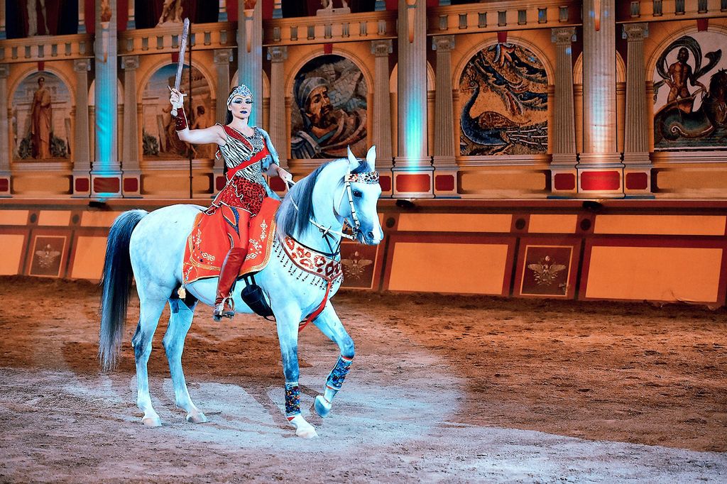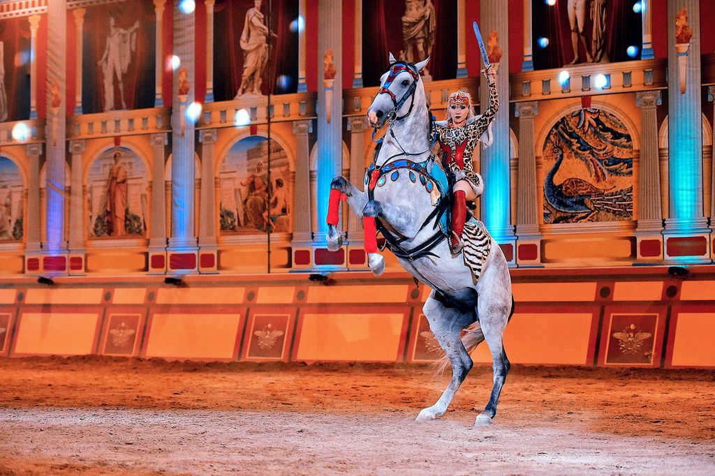 Невозможно найти человека, который не знал бы о существовании в Античные времена более воинственного и обольстительного племени, чем амазонки. Своим мастерством наездницы, владением оружием и отвагой, они наводили мистический страх на целые народы. Зрители увидят конные трюки, владение оружием, хлыстом, и джигитовку прекрасных амазонок. Также будут представлены великолепные жеребцы андалузской и арабской пород – потомки лошадей эпохи Боспорского царства.